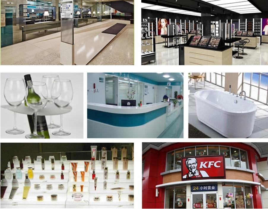 遮阳板、隔音板(声屏板)、电话亭、水族馆、室内墙布、宾馆及住宅装饰、灯饰等。